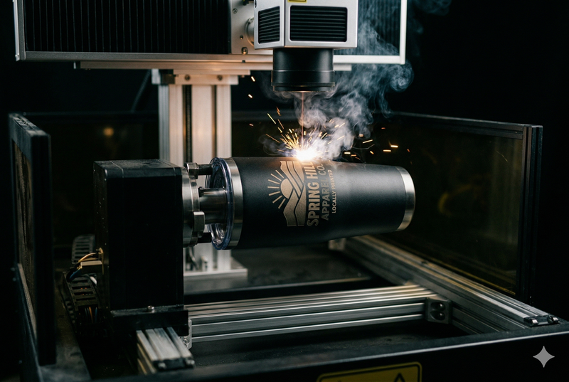 When you want your brand on something that lasts longer than a shirt, engraving is the answer. Tumblers, awards, drinkware, leather goods, tech accessories — if it's a surface, we can probably put your logo on it.